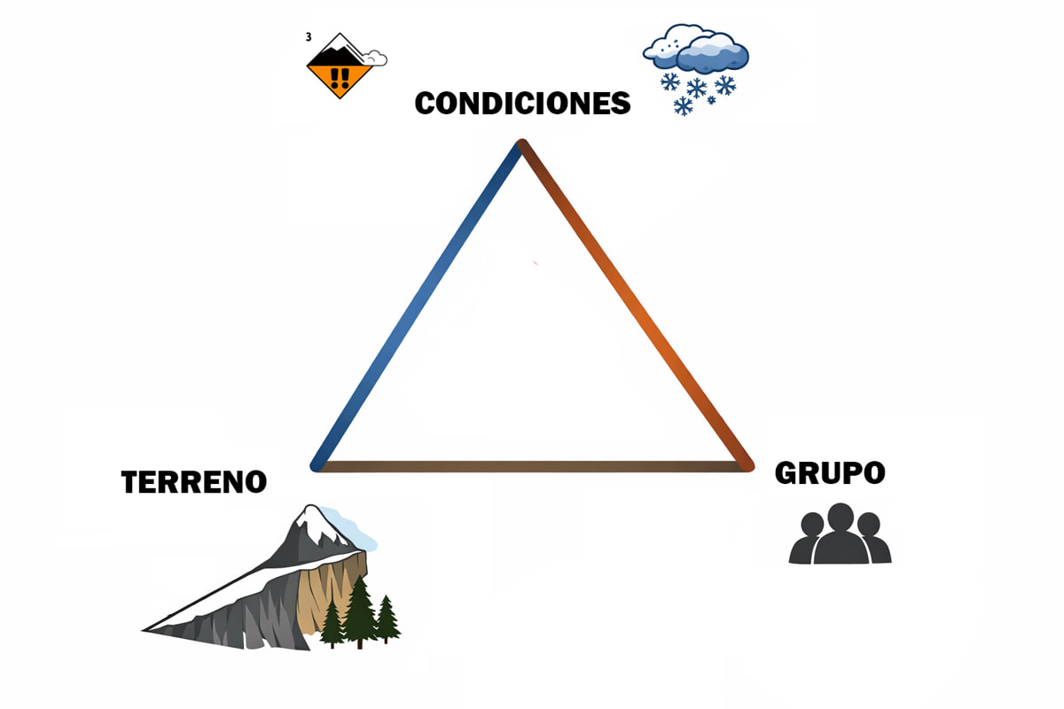 Es habitual representar los factores que determinan el peligro mediante un modelo triangular en el que cada vértice corresponde a uno de los tres elementos esenciales a la hora de planificar una actividad: condiciones, terreno y grupo.
