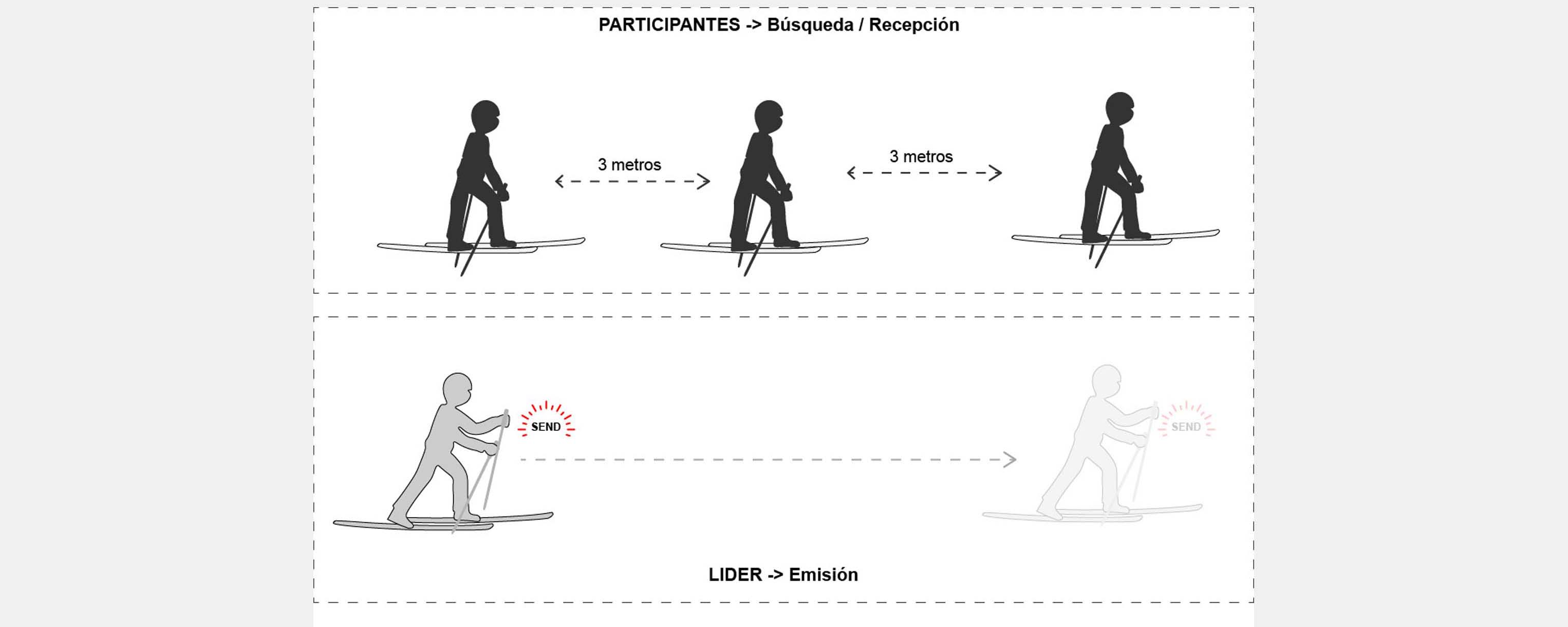 Una función interesante, presente también en otros DVAs, es la posibilidad de no tener que apagar el dispositivo durante tareas como el paleo o sondeo. En el Ortovox Diract Voice, este modo se denomina Standby. En él, el DVA permanece encendido, pero deja de emitir señal de forma temporal mientras no detecte movimiento, para no interferir con la señal de los compañeros que se encuentran buscando. La emisión se activa automáticamente en caso de una segunda avalancha si el DVA está en modo búsqueda o en modo Standby y transcurren dos minutos sin movimiento.